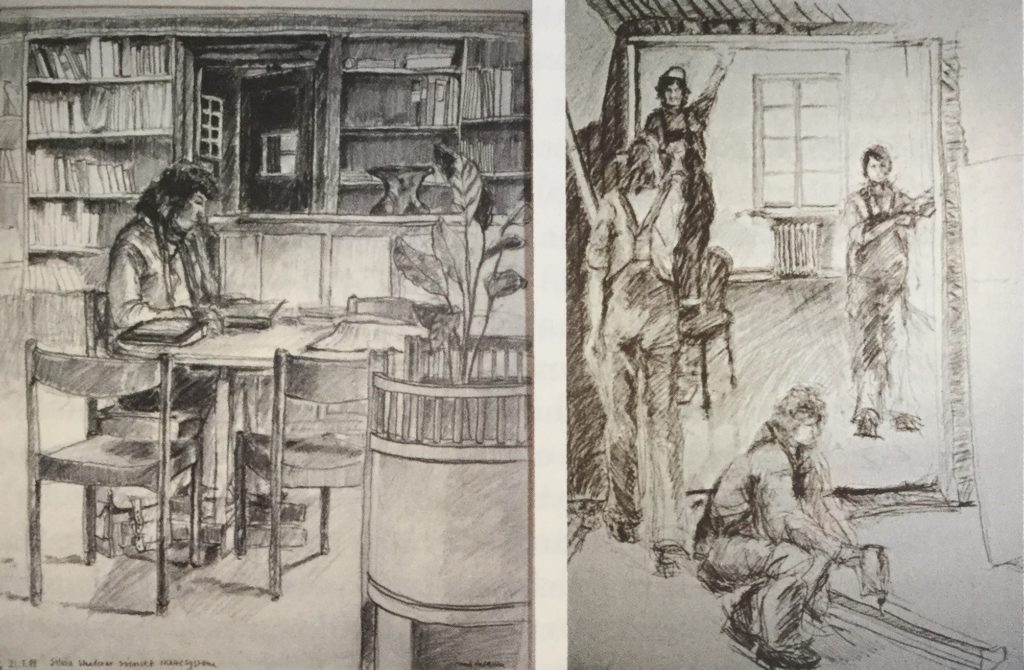 Teckningar av Marie Falksten visar bland annat hur byggkursens renovering av Kvinnohuset gick till.